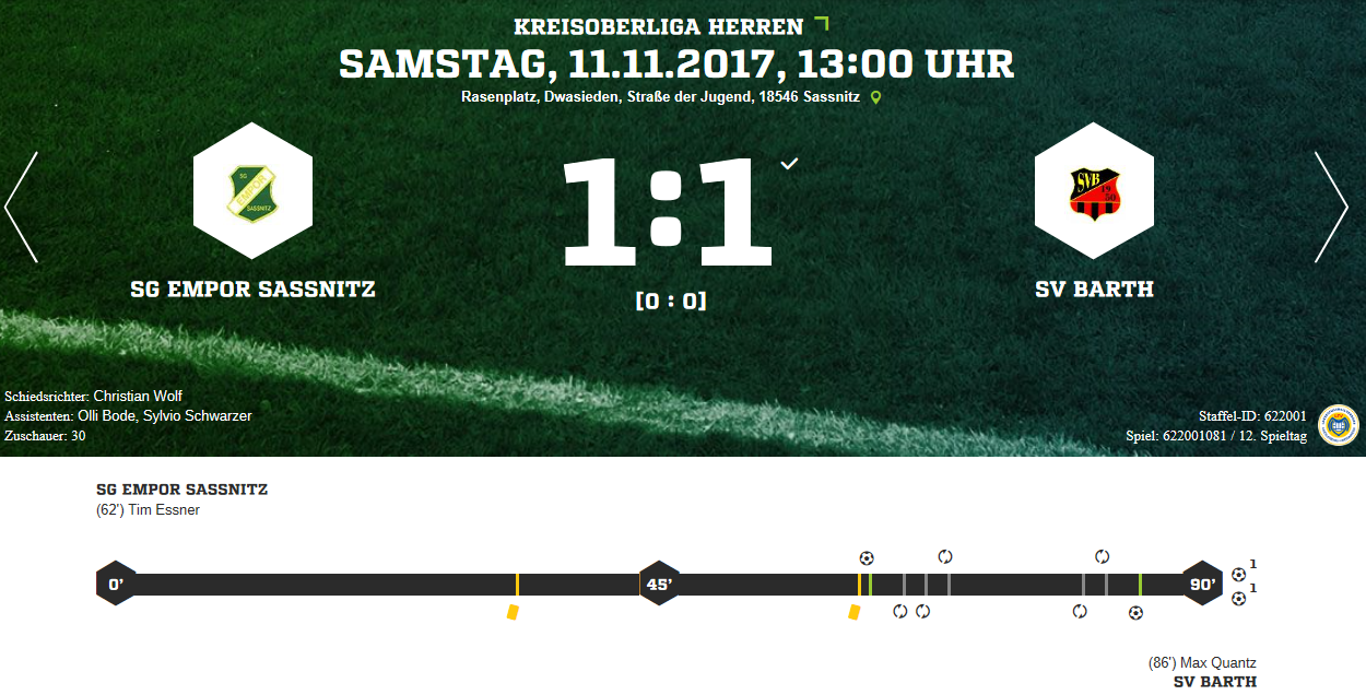 SG Empor Sassnitz - SV Barth 1:1 (0:0) Sassnitz/Dwasieden Am 12. Spieltag gastierte der ungeschlagene Tabellenführer aus Barth in der Hafenstadt. Bei widrigen äußeren Bedingungen und sehr schlechten Platzverhältnissen…