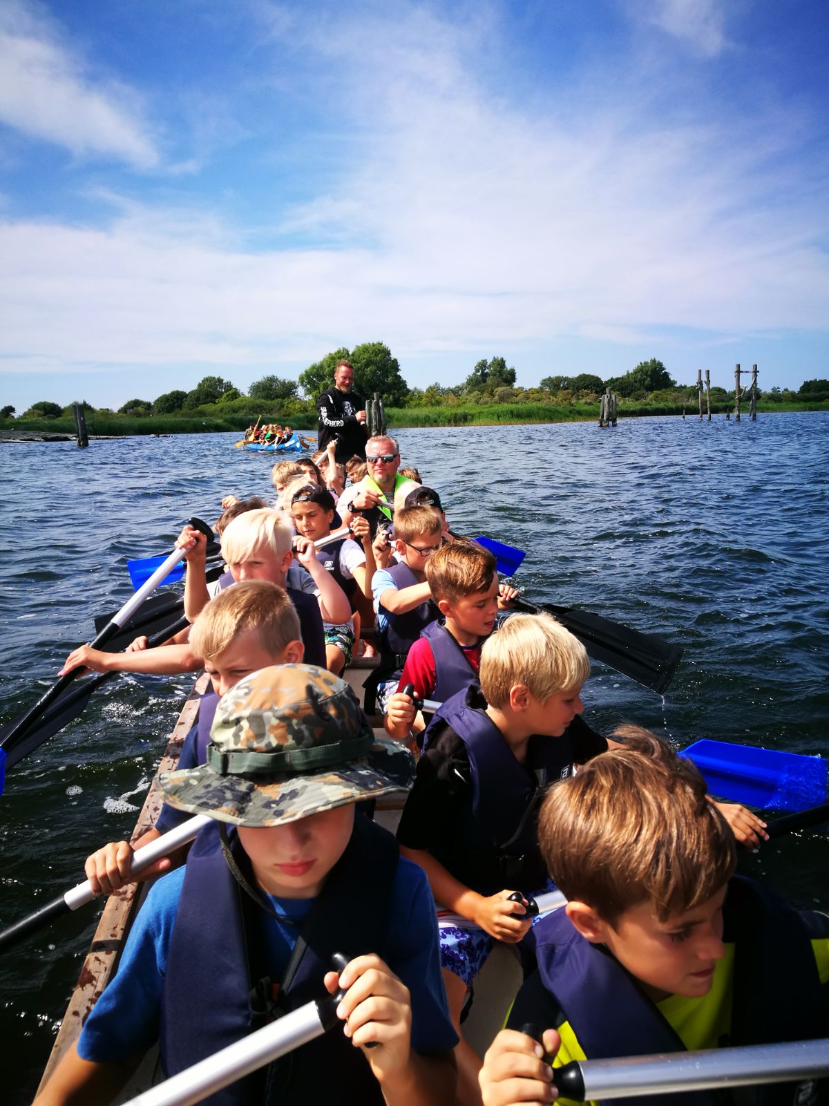 Am zweiten Tag gab es für die 9 Betreuer einen entspannten Tag, denn die Kinder wurden durch ein Programm der Rügen Piraten betreut. Es gab geteilte Gruppen, die abwechselnd am Vormittag und am Nachmittag mit dem Drachenboot und einem Riesenkanadier auf dem Bodden unterwegs waren. Der Trommler wurde durch die Kinder ausgesucht. Die andere Gruppe wurde durch einen Erlebnisparcours geführt und hatten verschiedene Aufgaben zu lösen. Das Bootfahren und der Erlebnisparcours diente auch der Teambildung und dem gegenseitigen kennen lernen, da die Kinder aus den unterschiedlichen Jugendabteilungen wie Fussball, Badminton, Leichtathletik, Basketball, Segeln und Handball kamen. Am Abend wurden Feuerschalen für Lagerfeuer an den Ostseestrand gefahren. Es gab Stockbrot und kleine Würstchen. Die Stöcke dafür wurden tagsüber gesammelt. Schnell ging dann die Sonne unter.